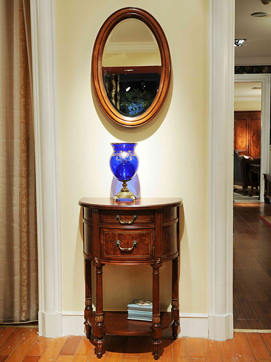 Поверхность мебели текстурирована – после покрытия лака остались продольные углубления и ложбинки, подчеркивающие естественную текстуру дерева, что придает мебели благородный, состаренный вид. Ножки, ящик и все декоративные элементы малой консоли выполнены из массива андаманского падука (твердая мебельная порода дерева, произрастающая в Западной Африке). Внутренние части ящиков выполнены из массива тропических пород дерева средней твердости. Большие плоские элементы (столешницы) выполнены из шпонированной МДФ. Для отделки используется изысканный шпон капа цейлонской камфары (переливающаяся перламутровая волна), индийского палисандра (темное дерево с ровной, линейной текстурой), венге (черная тонкая полоса).