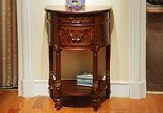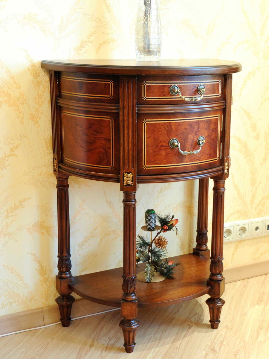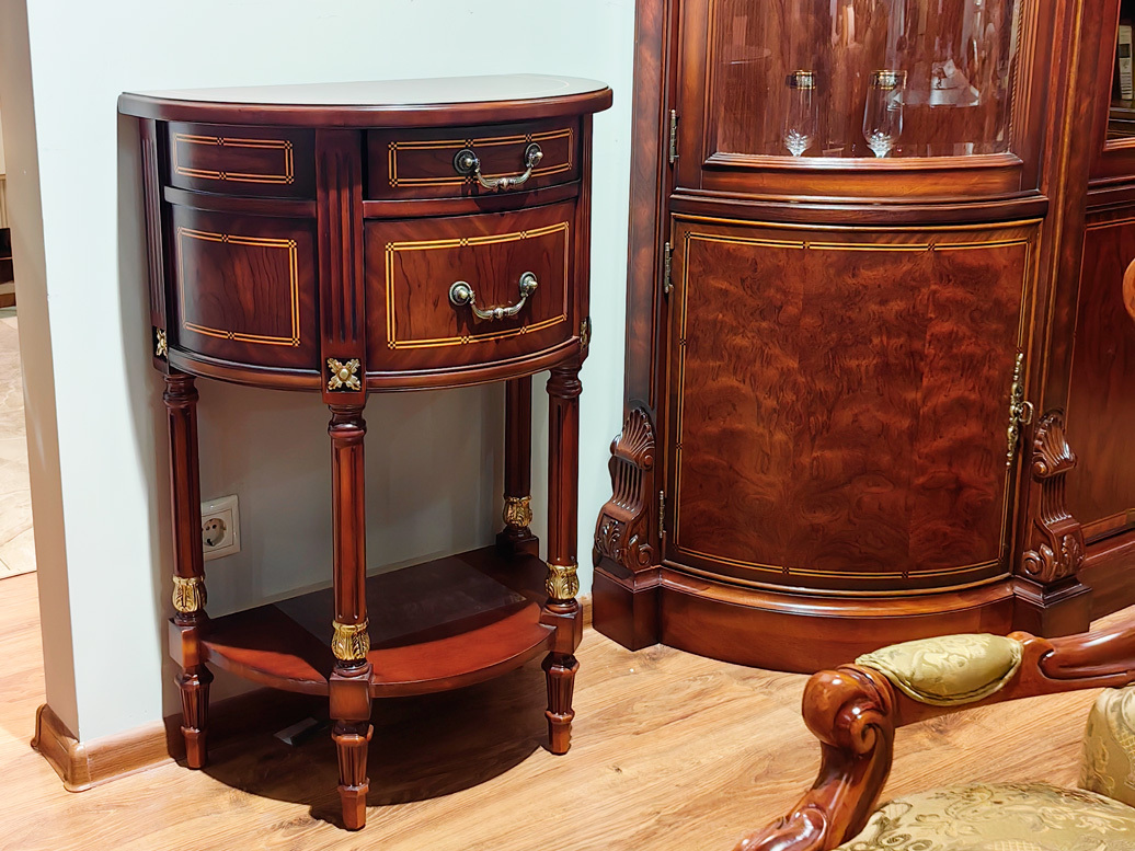 Консоль малая Louis XVI считается мелким интерьерным предметом для небольших зон. Расстояние по вертикали над нижней полкой - 375 мм. Высота нижней дверцы - 185 мм. Резьба и декоративные элементы выделены бронзой.