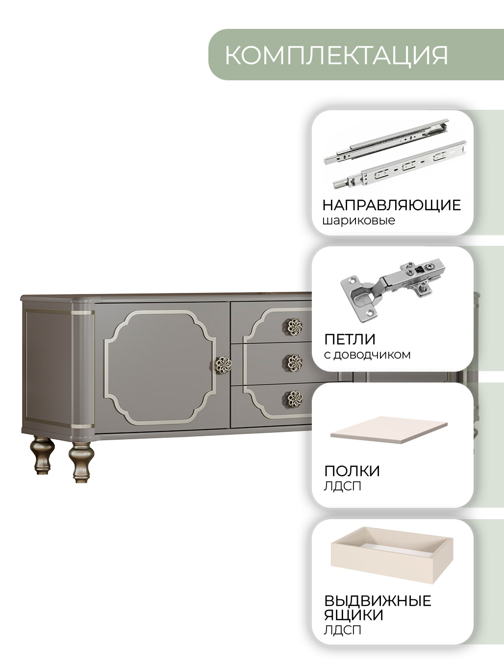 Дверные петли с доводящим механизмом. Выдвижные ящики оснащены шариковым выдвижным механизмом