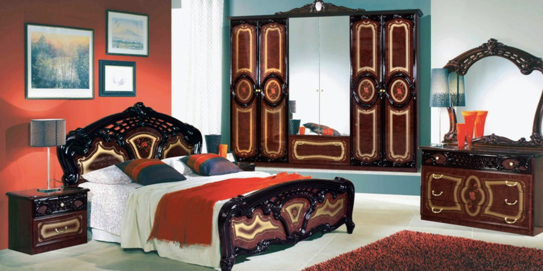 Не оставит равнодушным и цветовое решение - насыщенный цвет могано, доходящий до шоколадного или отливающий манящими кофейными нотами, создает темпераментную и одновременно теплую игру, которая будет особенно притягательна в уютной спальне.