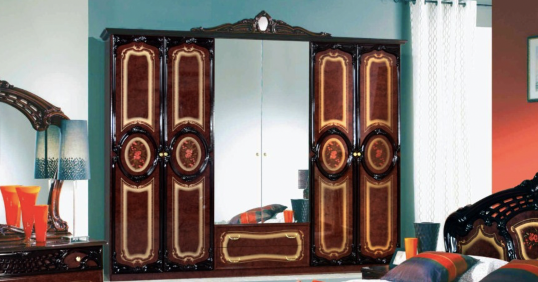 Большой, вместительный и очень красивый шестидверный платяной шкаф Роза привлечет элегантностью отделки фасада и створок. Венчает гардероб резная корона, а крайние дверцы украшены нежным цветочным рисунком, обрамленным лепниной. Две центральные створки зеркальные, они помогут Вам окинуть свой наряд с головы до ног и позволяют визуально увеличить пространство, добавив ему объема и воздуха.