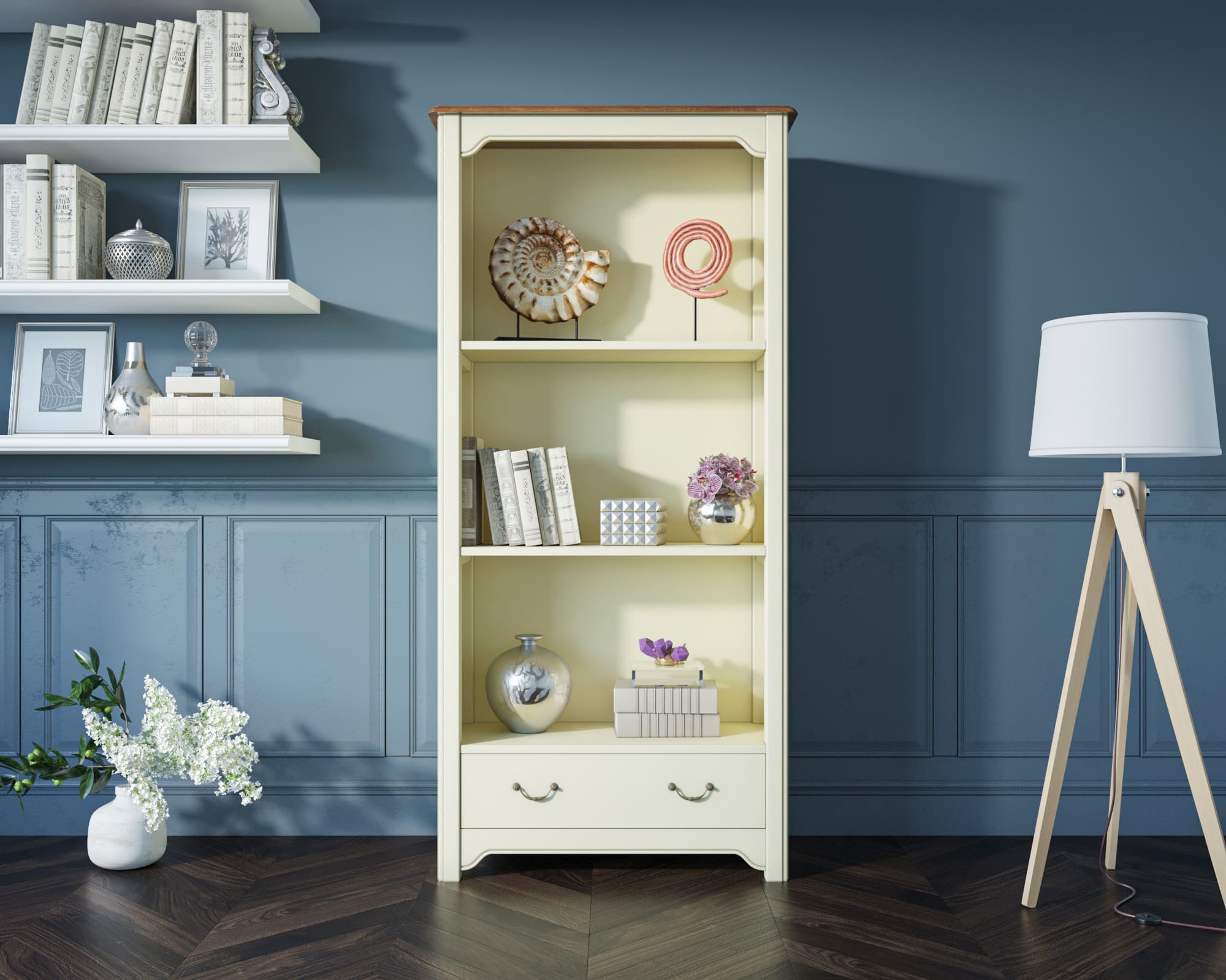 Стеллаж бежевого цвета из французской коллекции Olivia Beige выполнен с использованием натурального и долговечного дерева береза. Данная модель является представителем деревенского стиля кантри и будет прекрасно смотреться в детской комнате или кабинете с соответствующим интерьером.